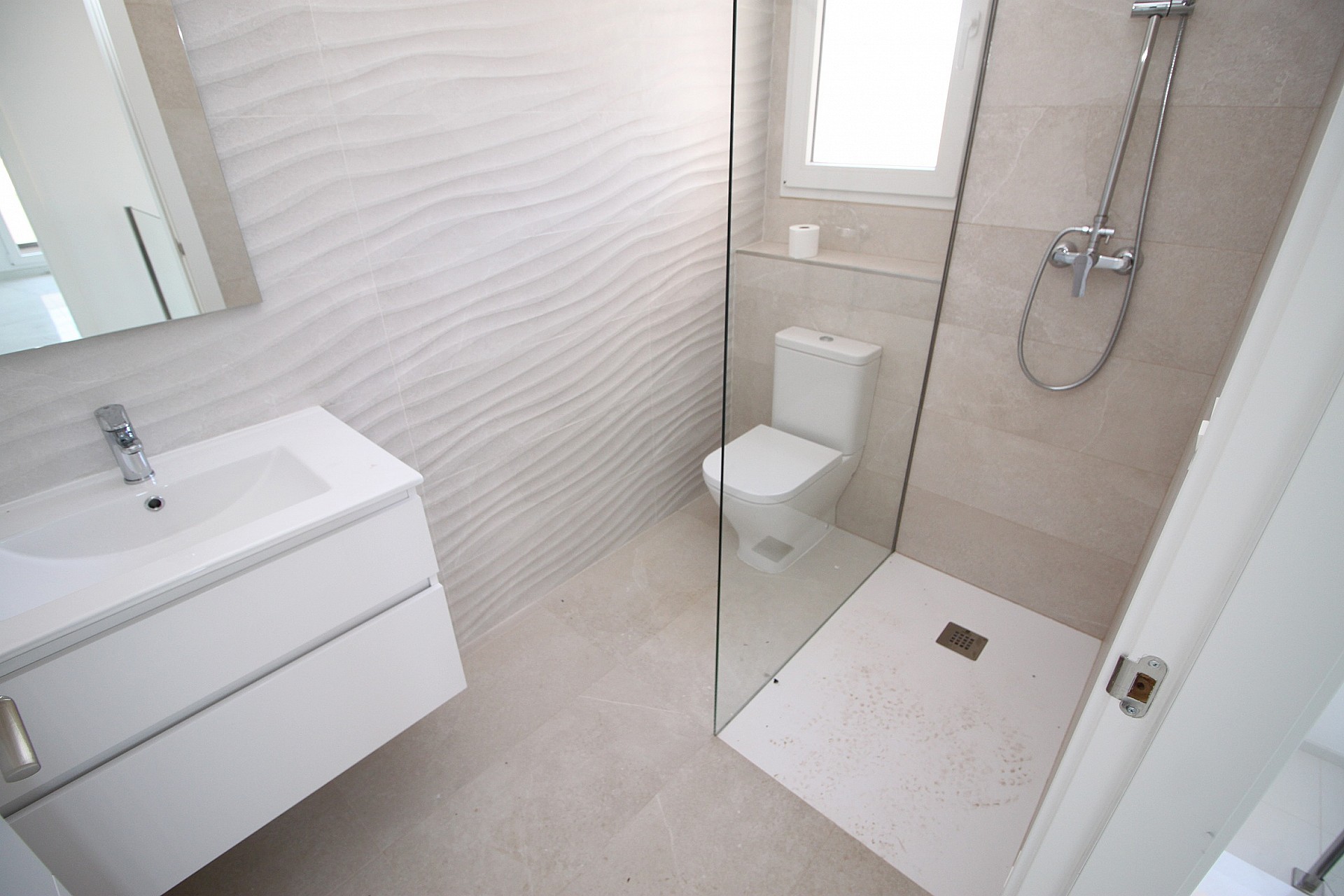 Bathrooms include a shower column, shower tray or bath, sink units (various colours to choose from) with sinks, taps and mirrors, plus a big selection of wall tiles., and a wide selection of ceramic floor tiles, with different colours, wood effect, etc.
