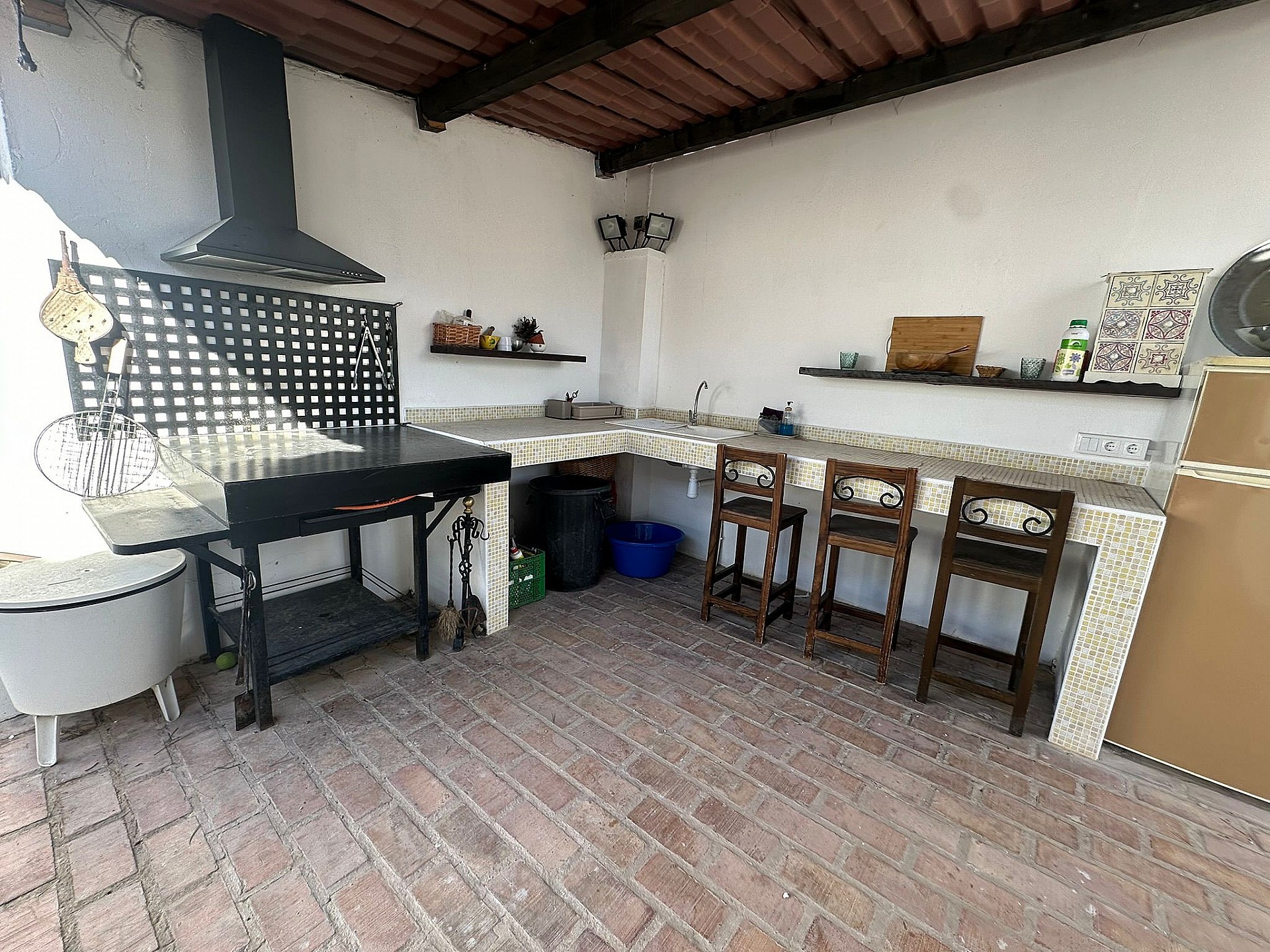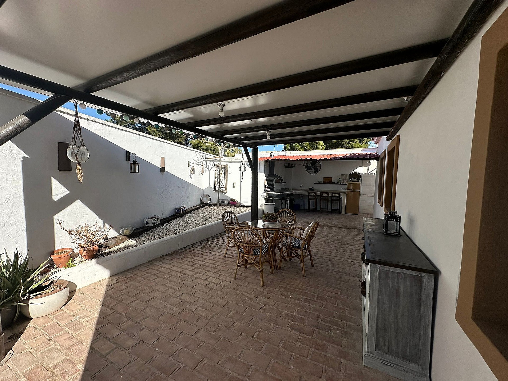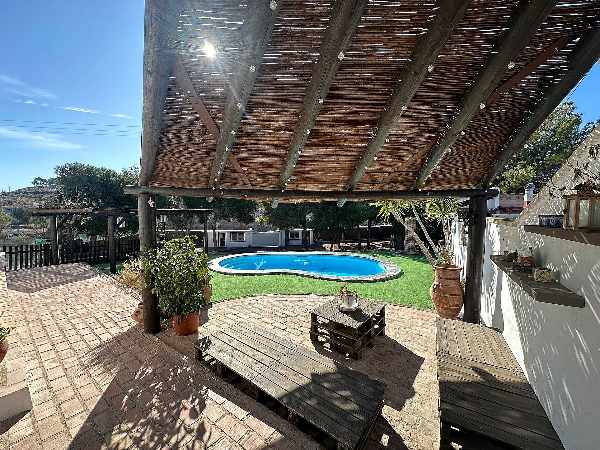Villa Large Detached Villa walking distance to Monovar. Detached Villa walking distance to Monovar, with a size of around 100m2, 3 bedrooms and 1 bathroom, with a lounge-dining room and open plan kitchen. The plot size is 2000m2, fully enclosed with an automatic gate entrance. There is a swimming pool, a 45m2 summer kitchen by the pool with a bathroom, open barbecue area, two storage rooms, a childrens play room and various seating areas. The garden has big pine trees ideal for shade in the summer. Fully reformed villa ready to move in Monovar is a small town in Alicante province, with a population of over 13,000 people. It is about 15 km from Pinoso and famous for its marble quarries, shoe making and wine. It is in a pretty, mountainous area, the town stands at a height of 341m (1,119 ft). Monovar has several traditional fiestas during the year, ranging from “Dwarves and Giants' ' in July to the week-long town fiesta in September in honour of the Virgen de los Remedios. Like many towns in the area, traditional food includes rice dishes made with rabbit and snail, gazpacho manchego – a hearty rabbit stew, migas – fried breadcrumbs with garlic and usually chorizo and of course the local red wine. There are 4 bodegas close by. The modern day town has many bars and restaurants, small shops, a large supermarket, bullring, two wineries, a theatre/concert hall and a cultural centre. Monovar is a safe and friendly place to live and makes an interesting day visit. It is located on the CV83, the main road that runs from Elda to Pinoso.Share