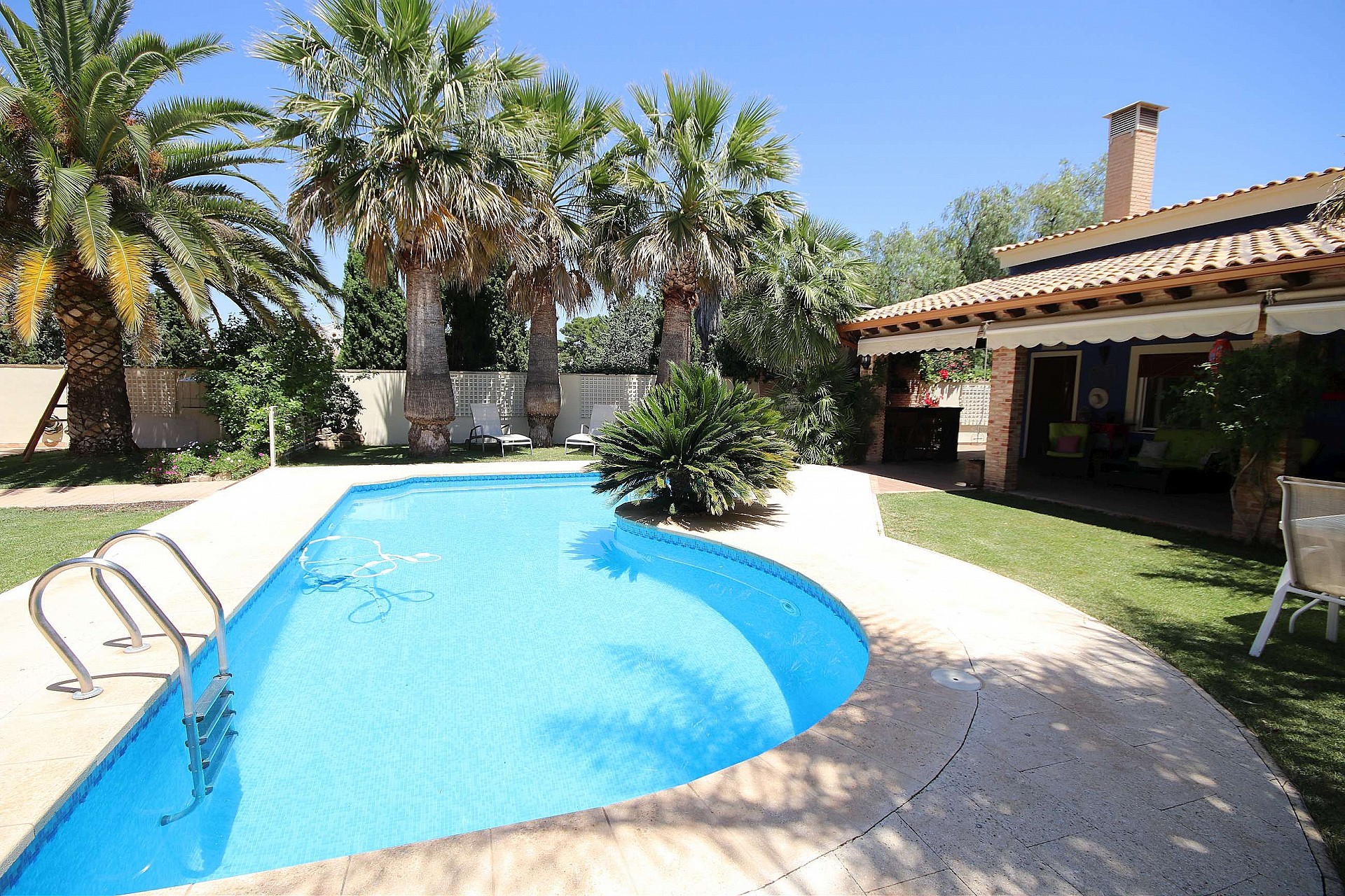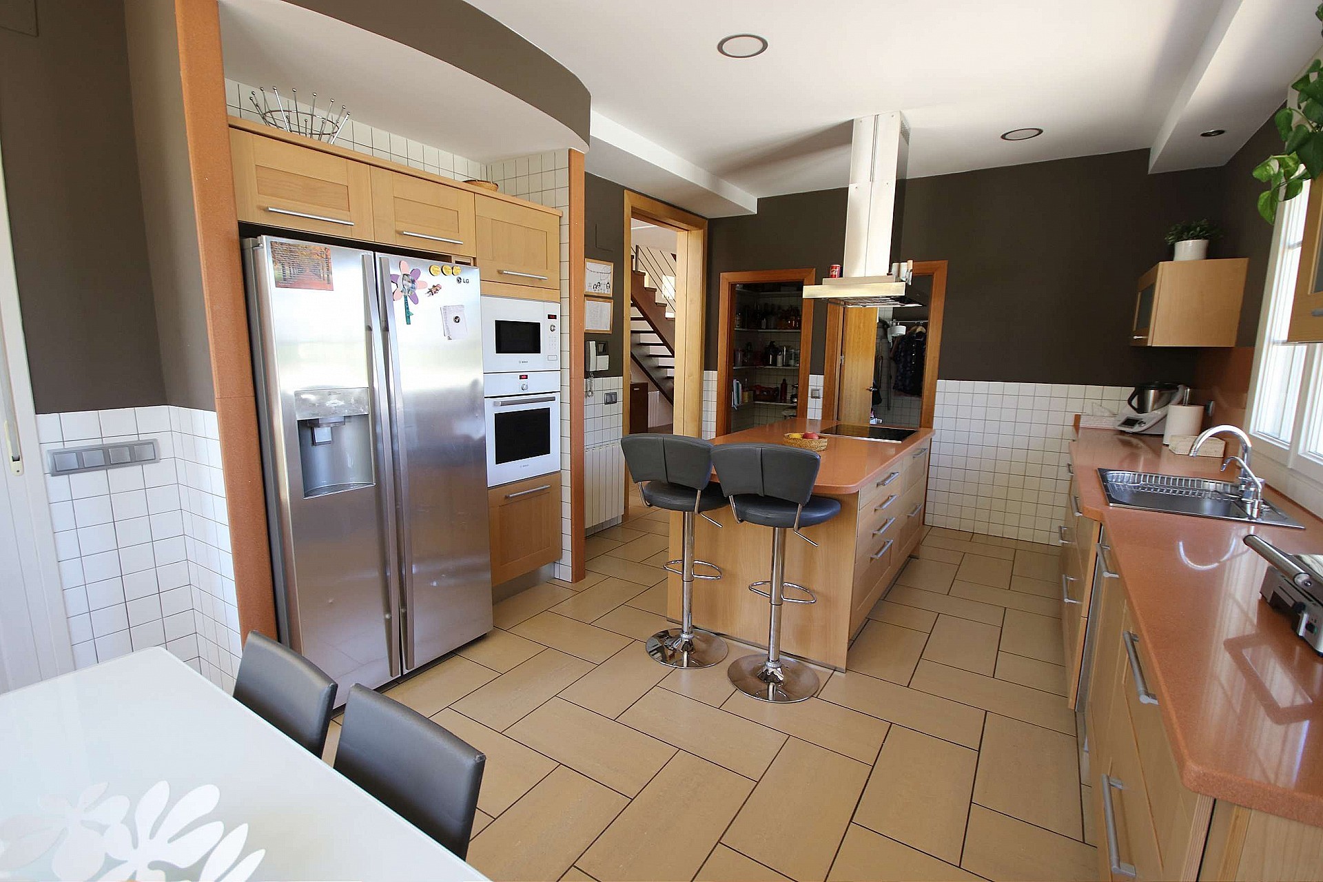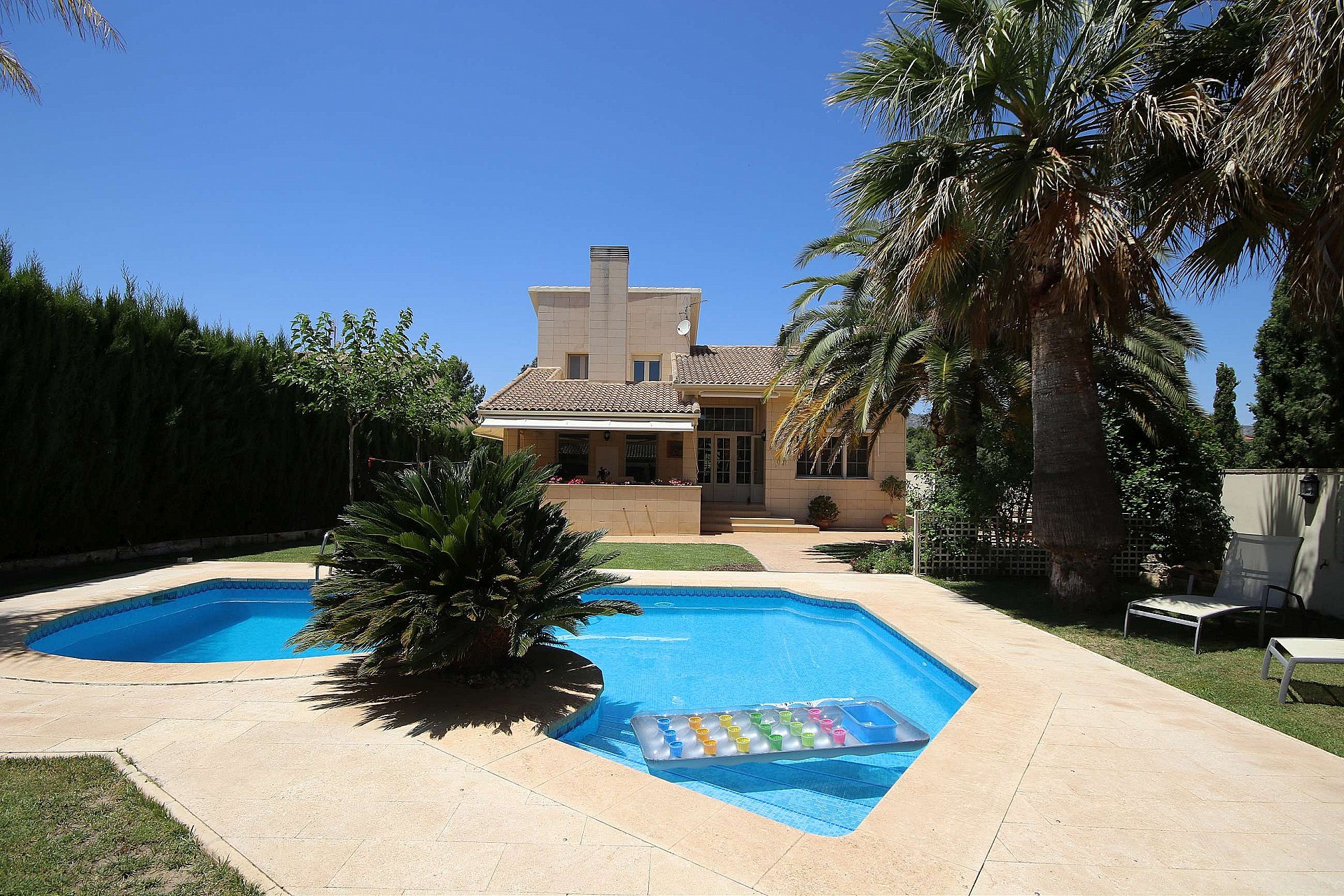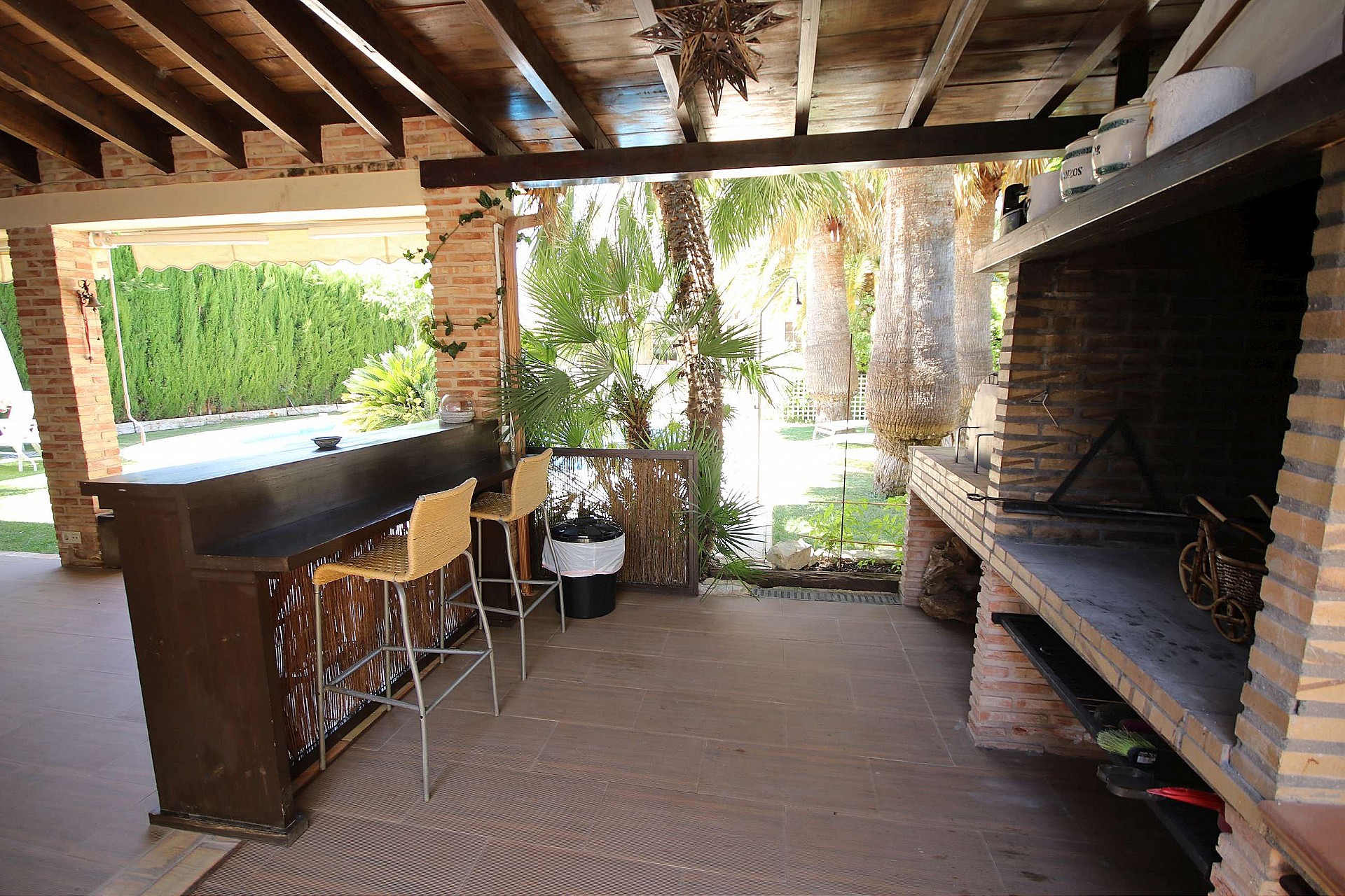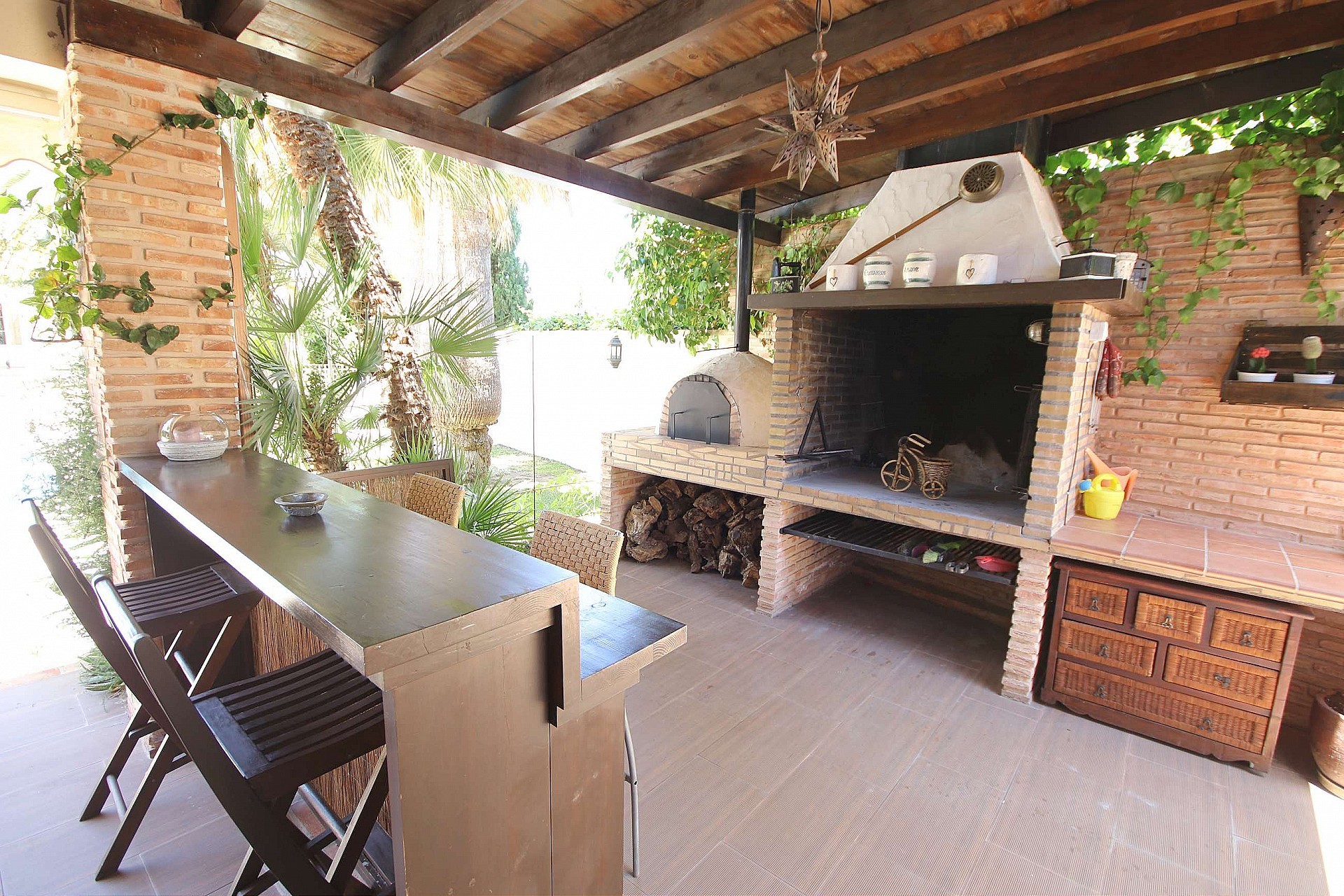 Villa Large Villa with a pool and garden. Large urban Town House in the best area of Monovar, with a private garden with a lovely swimming pool and outside kitchen-dining room. The plot size is 1160m² with a total build size of 587m². The house has two floors and a basement, with 5 bedrooms (3 with an ensuite bathroom and dressing room), 5 bathrooms (+ another outside), a lounge-dining room with a fireplace, large kitchen with a pantry, utility room, an office (which could be a 6th bedroom), entrance hallway and a terrace off the master bedroom overlooking the garden and town. It also has ducted air conditioning in all the rooms, heating, pvc windows, automatic windows in some rooms, automatic shutters and automatic awnings, furniture made to fit in every room, sold furnished. Two whirpool baths, and two bathrooms with both a walk-in shower and bath. The basement has space for a few cars and also a toilet, boiler room and a games room for children. Outside there is natural grass around the pool and an automatic irrigation system for all the garden, and a covered terrace by the outside BBQ. Top quality build in a great location, walking distance to shops, restaurants and many other services and amenities. Monovar is an excellent place to take a break from the stressful city, it’s a very quiet town with a population of just over 12,000. People here are very polite and friendly, always keen to help. The town has several supermarkets (Mercadona, Hiperber…) which are easy to access and open Monday to Saturday, a weekly market and a good 24h medical centre. There are various parks where you can take your children, and a good choice of pubs to have a drink and restaurants where you can try local and Mediterranean food. In Monovar there’s also an indoor swimming pool open all year, with a spa and sauna, as well as a gym with personal trainers, zumba classes, spinning, yoga etc. Monovar is only 30 minutes away from the city of Alicante, the airport and beaches. In September Monovar celebrates its local fiestas with a lot of events where everyone is welcome. The city of Elda & Petrer is less than a 10 minutes drive away, which has a large Hospital with English speaking doctors, a huge range of bars and restaurants, indoor shopping centre, big international gym, Carrefour, Aldi, Lidl, Cinema with English movies shown weekly, bowling and fast food outlets.Share